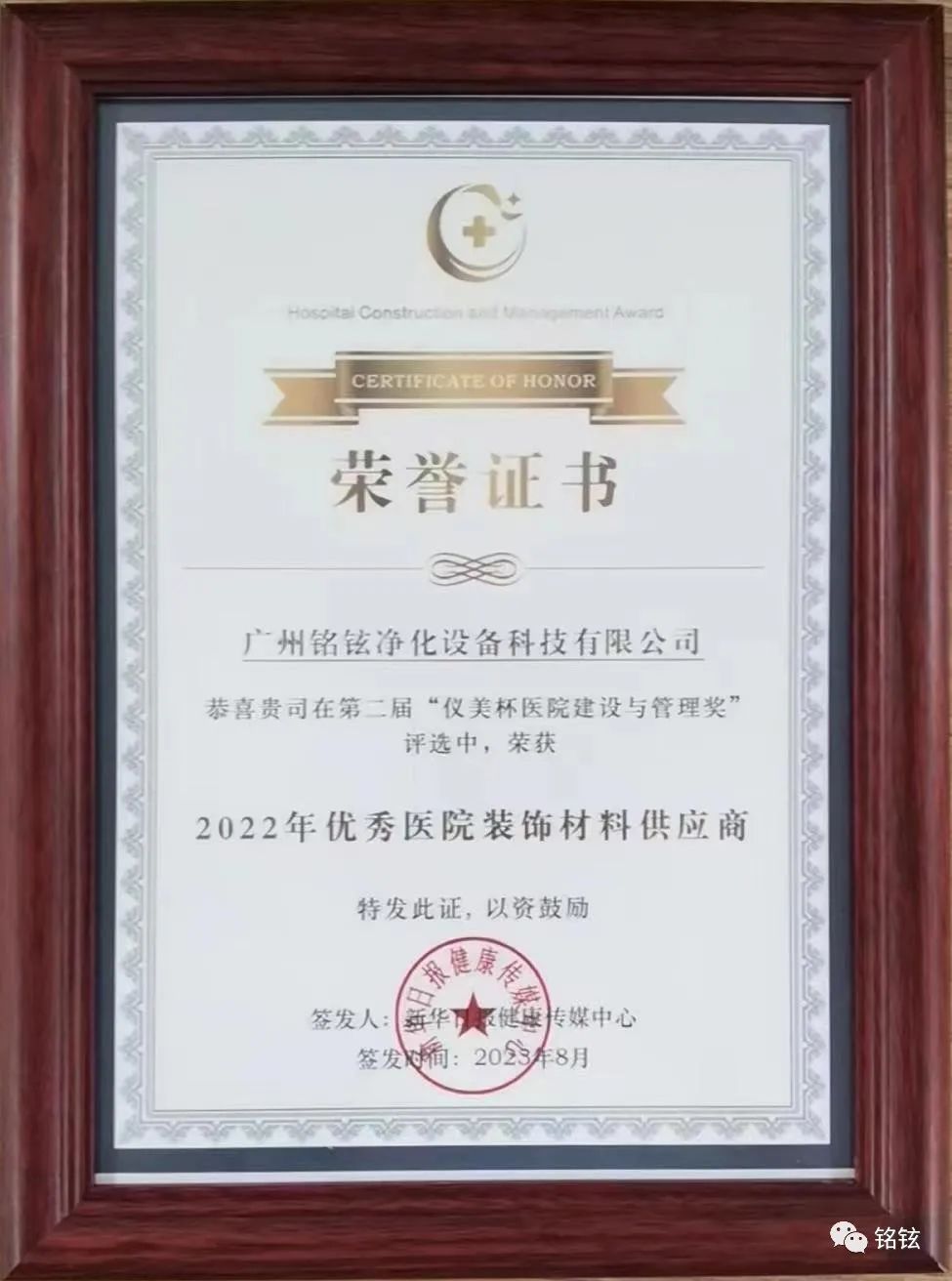 大会同步举行了2023医院建设与管理奖颁奖仪式。广州铭铉净化设备科技有限公司荣获“2022年优秀医院装饰材料供应商”荣誉称号。